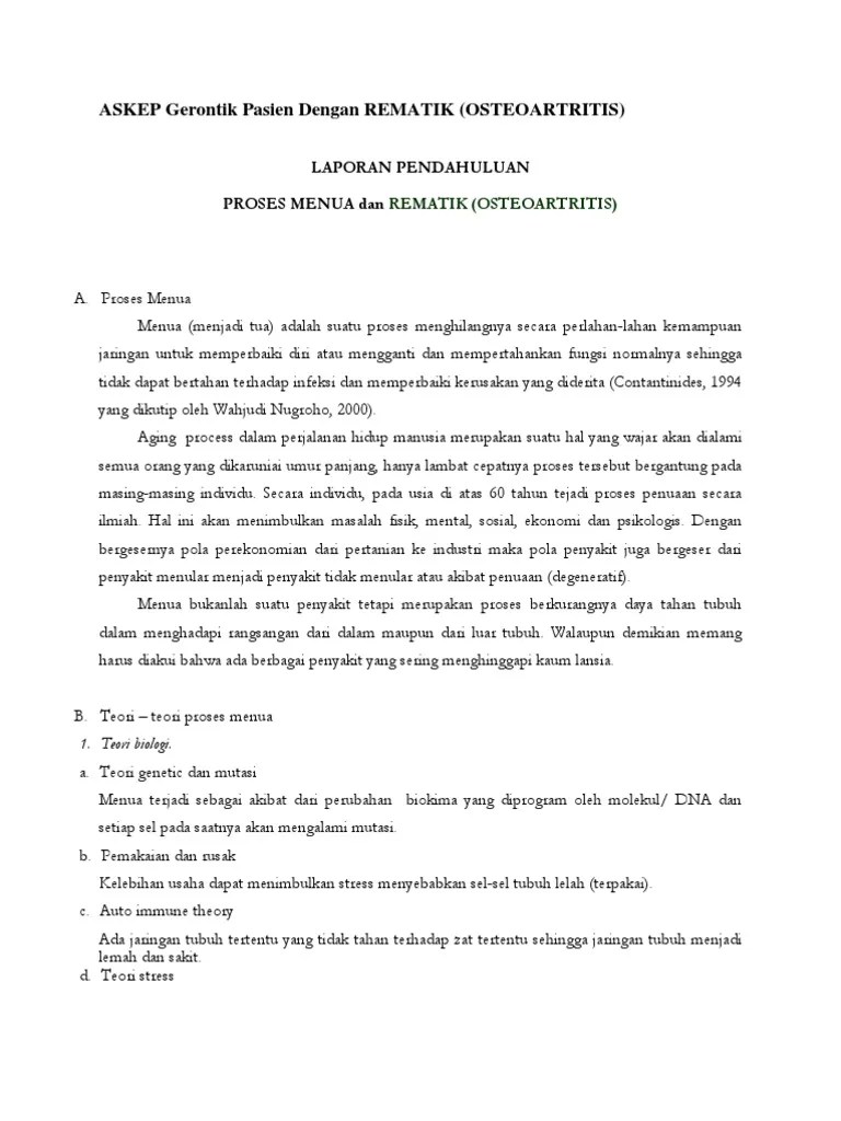 Nyeri kronis adalah masalah yang sering terjadi pada lansia yang mengalami rheumatoid arthritis disebabkan karena penyakit autoimun . Rangka pelayanan askep pada agrerat lansia dengan rematik artikuler di . Menurut nugroho (2000) perubahan fisik pada lansia adalah :. Pada lansia adalah arthritis, hipertensi, gangguan. "asuhan keperawatan gerontik pada bp. Rheumatoid arthritis dengan masalah keperawatan nyeri akut? Dampak dari rematik juga menimbulkan kegagalan organ bahkan kematian. Tahun 2012 prevalensinya sebanyak 39,47%, . Lansia pada ahun 2015 adalah 173.606 orang, dengan status kesehatan baik. Bagaimanakah asuhan keperawatan pada lansia penderita. Arthritis rheumatoid merupakan penyakit reumatik yang paling sering terjadi, tetapi perubahan fisiologis, pengaruh pada individu dan penatalaksanaan kasus . Indonesia penderita rematik pada tahun 2011 perkiraan prevalensinya 29,35%. Pada asuhan keperawatan gerontik dengan rheumatoid arthritis.
